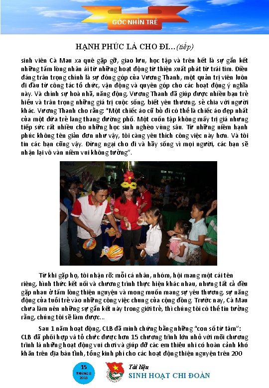 GÓC NHÌN TRẺ HẠNH PHÚC LÀ CHO ĐI…(tiếp) sinh viên Cà Mau xa quê gặp gỡ, giao lưu, học tập và trên hết là sự gắn kết những tấm lòng nhân ái từ những hoạt động từ thiện xuất phát từ trái tim. Điều đáng trân trọng chính là sự đóng góp của Vương Thanh, một quản trị viên luôn đi đầu từ công tác tổ chức, vận động và quyên góp cho các hoạt động ý nghĩa này. Và chính sự hoà nhã, năng động, Vương Thanh đã giúp được nhiều bạn trẻ hiểu và trân trọng những giá trị cuộc sống, biết yêu thương, sẻ chia với người khác. Vương Thanh cho rằng: “Một chiếc áo cũ bỏ đi có thể là chiếc áo đẹp nhất của một đứa trẻ lang thang đường phố. Một cuốn tập không mấy trị giá nhưng tiếp sức rất nhiều cho những học sinh nghèo vùng sâu. Từ những niềm hạnh phúc không tên giản đơn như vậy, tôi càng yêu thích công việc này hơn. Và tôi tin các bạn cũng vậy. Đừng ngại cho đi và hãy sống vì mọi người, các bạn sẽ nhận lại vô vàn niềm vui không tưởng”. Từ khi gặp họ, tôi nhận rõ: mỗi cá nhân, nhóm, hội mang một cái tên riêng, hình thức kết nối và chương trình thực hiện khác nhau, nhưng tất cả đều gặp nhau ở tấm lòng thiện nguyện và mong muốn mang sự yêu thương, sự năng động của tuổi trẻ vào những công việc chung của cộng đồng. Trước nay, Cà Mau chưa làm nên những sự gắn kết này trong giới trẻ, thì chúng tôi có thể tin tưởng rằng, chúng tôi sẽ làm được. . . Sau 1 năm hoạt động, CLB đã minh chứng bằng những “con số từ tâm”: CLB đa phô i hơ p va tô chư c đươ c hơn 15 chương tri nh lơ n nho với mô i chương tri nh la như ng hoa t đô ng vui chơi va giu p đơ ca c em thiê u nhi co hoa n ca nh kho khăn trên đi a ba n ti nh, tổng kinh phí cho các hoạt động thiện nguyện trên 200 15 THÁNG 8 2015 Tài liệu SINH HOẠT CHI ĐOÀN
