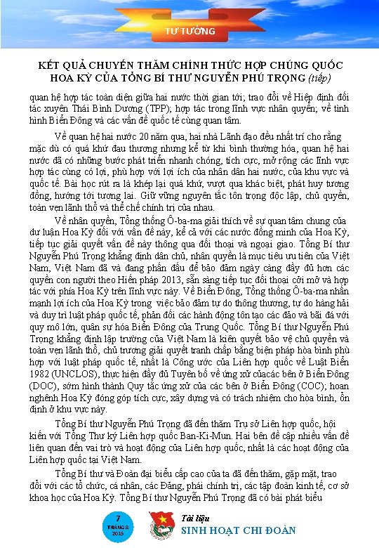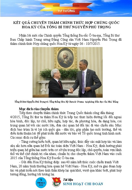 TƯ TƯỞNG KẾT QUẢ CHUYẾN THĂM CHÍNH THỨC HỢP CHÚNG QUỐC HOA KỲ CỦA TỔNG BÍ THƯ NGUYỄN PHÚ TRỌNG Nhận lời mời của Chính quyền Tổng thống Ba-rắc Ô-ba-ma, Tổng Bí thư Ban Chấp hành Trung ương Đảng Cộng sản Việt Nam Nguyễn Phú Trọng đã thăm chính thức Hợp chủng quốc Hoa Kỳ từ ngày 06 - 10/7/2015. Tổng Bí thư Nguyễn Phú Trọng và Tổng thống Hoa Kỳ Barack Obama tại phòng Bầu dục của Nhà Trắng Mục đích của chuyến thăm Tiếp theo chuyến thăm chính thức Trung Quốc thành công đầu tháng 4/2015, Tổng Bí thư ta thăm Hoa Kỳ là tiếp tục thực hiện đường lối đối ngoại hòa bình, độc lập, tự chủ, hữu nghị, hợp tác, đa phương hóa, đa dạng hóa, coi trọng quan hệ với các nước lớn, đưa các quan hệ đối tác đi vào chiều sâu. Mục đích bao trùm là vì lợi ích quốc gia - dân tộc, góp phần tạo môi trường, thế và điều kiện thuận lợi để phát triển đất nước và bảo vệ Tổ quốc trong tình hình mới. Các mục đích cụ thể gồm: - Tăng cường hiểu biết, quan hệ hữu nghị; thúc đẩy các mặt hợp tác và làm sâu sắc hơn nữa quan hệ Đối tác toàn diện Việt Nam - Hoa Kỳ; định hướng phát triển quan hệ giữa hai nước trên cơ sở tôn trọng độc lập, chủ quyền, toàn vẹn lãnh thổ và thể chế chính trị của nhau; chuẩn bị cho chuyến thăm Việt Nam vào cuối 2015 của Tổng thống Hoa Kỳ Ba-rắc Ô-ba-ma. - Gửi đến Hoa Kỳ thông điệp: sau 40 năm kết thúc cuộc chiến tranh Việt Nam, 20 năm bình thường hóa quan hệ Việt Nam - Hoa Kỳ, mở ra giai đoạn hợp tác và phát triển nới theo tinh thần khép lại quá khứ, vượt qua khác biệt, phát huy tương đồng, hướng tới tương lai. 5 THÁNG 8 2015 Tài liệu SINH HOẠT CHI ĐOÀN