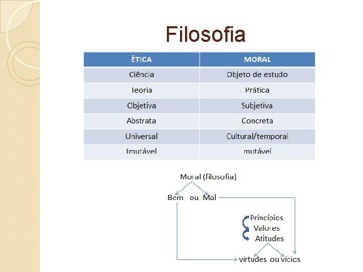 Ética e Moral Para diferenciar ética de moral é possível seguir dois caminhos: etimologia e filosofia Etimologia: estudo da origem e do significado das palavras Ética – grego – ethos – costumes, valores, hábitos, tradições Moral – latim – mos, moris, mores – costumes, valores, hábitos, tradições Ética x moral x direito
