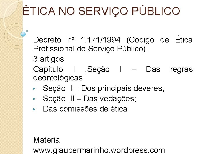 ÉTICA NO SERVIÇO PÚBLICO Decreto nº 1. 171/1994 (Código de Ética Profissional do Serviço Público). 3 artigos Capítulo I , Seção I – Das regras deontológicas • Seção II – Dos principais deveres; • Seção III – Das vedações; • Das comissões de ética Material www. glaubermarinho. wordpress. com