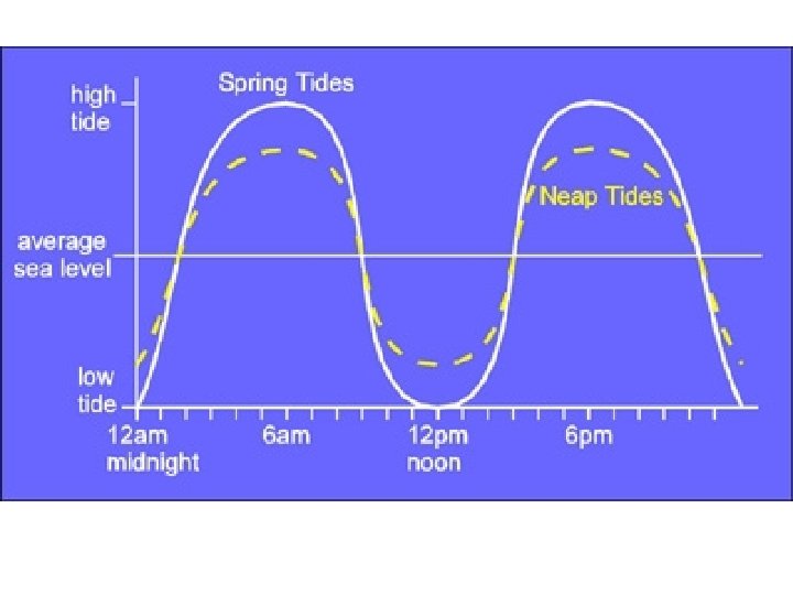• • • Description of tides High water: a water level maximum ("high tide") Low water: a water level minimum ("low tide") Tidal range: the difference between high and low tide Spring Tide: full moon and new moon (14. 77 days) Neap Tide: 1 st quarter and 3 rd quarter (14. 77 days) High tide Intertidal zone Low tide
