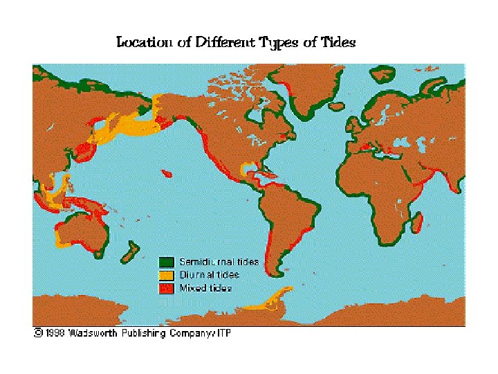 Tidal Patterns Semidiurnal tides- two high and two low per day; Cape Cod, MA (high latitudes) Diurnal tides- one high and one low per day; Mobile, AL (low latitudes) Mixed pattern tides- Two high and two low tides per day BUT with successive high tide levels that are VERY DIFFERENT from each other; Hawaii (mid latitudes) Type of tide depends on: • Position on the globe • Water depth • Contour- shape of ocean basins