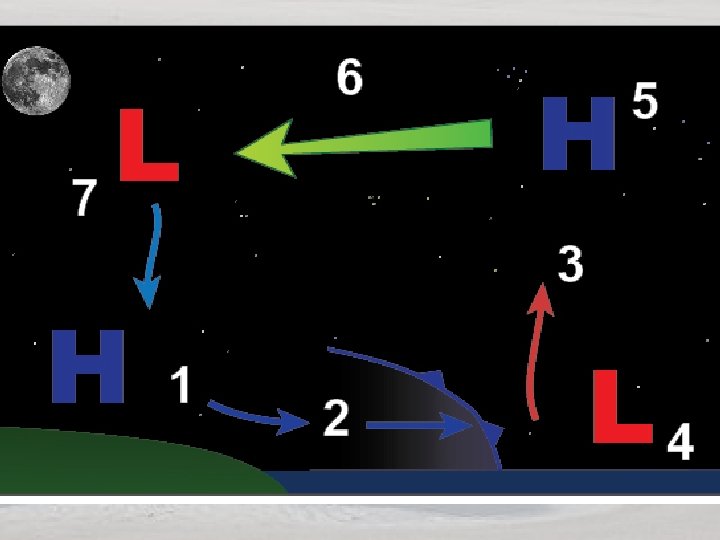 Land Breeze 1. Land temperature falls below ocean temperature resulting in increase in air’s density. Gravity’s pulls dense air offshore. 2. More dense air undercuts the lighter, warmer air over water. 3. Forces air up into the atmosphere 4. Raising air from a weak low pressure area. 5. Rising air accumulates aloft forming an area of higher pressure 6. Air flows back toward land from high pressure to low pressure 7. Air cools, increases in density, then sinks causing an increase in density and high pressure.