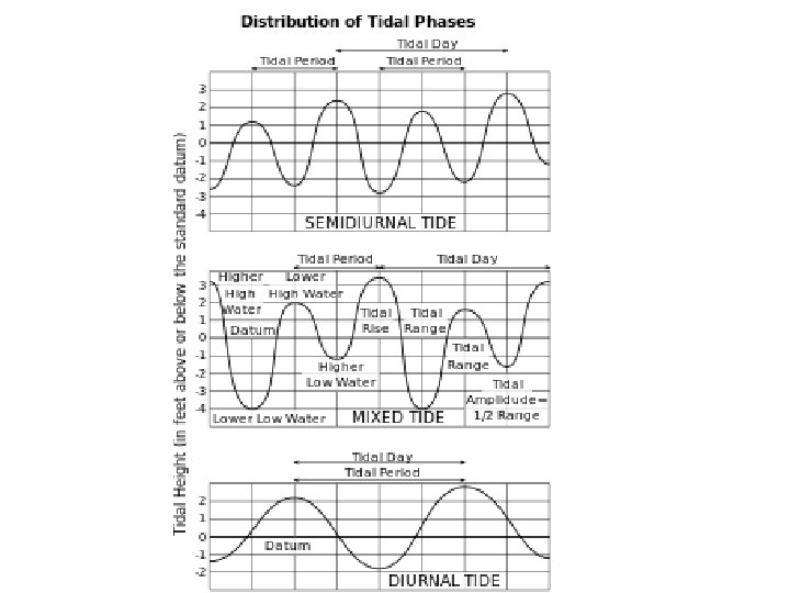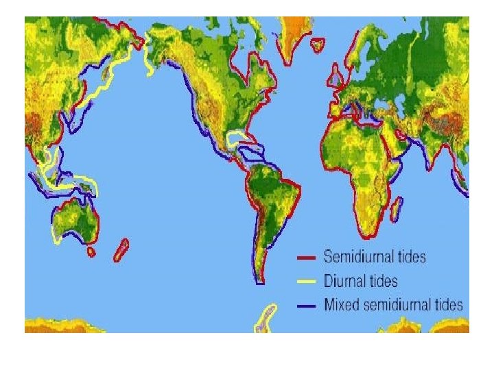 Tidal Patterns • Diurnal – Daily tides, single high and low per day, gulf Mexico, South East Asia • Semidiurnal-twice Daily, two high and two low per day, same heights, Atlantic coast U. S. • Mixed- most common, successive high and low tides will have very different heights, Pacific coast U. S. • Nodal Line- Water rocks back and forth in basins, center of rocking is the nodal line where depth does not change produce standing waves at edge