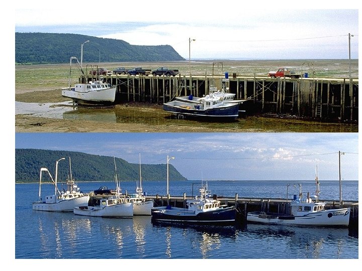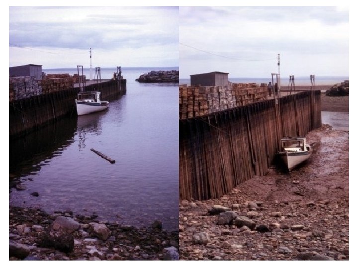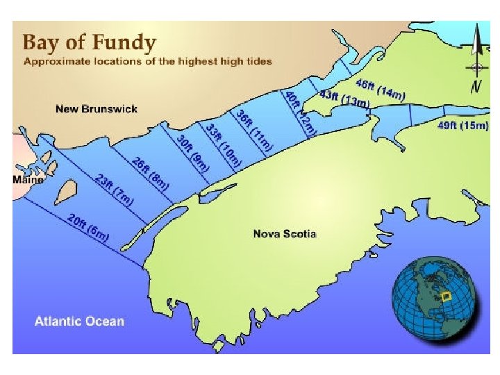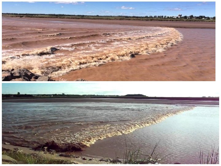 Bay of Fundy, Nova Scotia • Bay of Fundy-standing waves along with constructive interference create largest tides in the world, 56 feet at upper end • Bay has a very wide opening, length is 160 miles and the bottom ramps up, Bay curves to the right so coriolis effect helps • Reflection and Amplification also play a part.