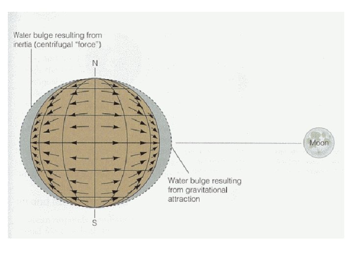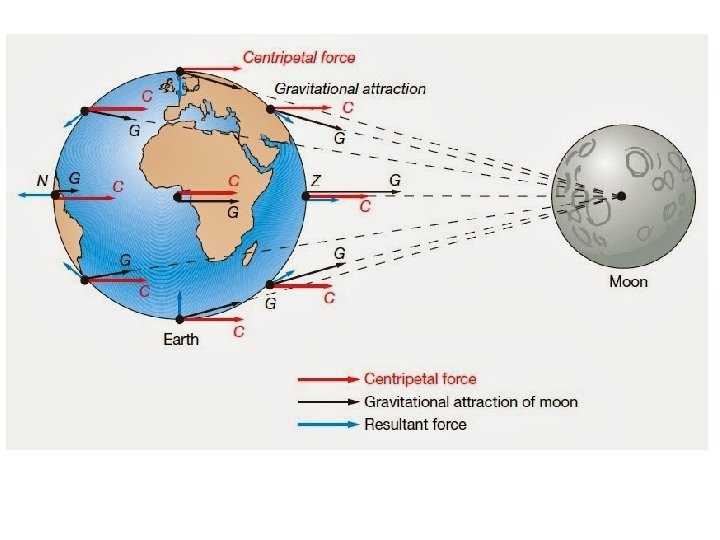 Tidal Forces • Tide generating forces push water into two equal bulges on opposite sides of the Earth, one towards the moon because of gravity and the other away from the moon because of centripetal force • Lunar Day is 50 minutes longer than the Solar Day , while Earth rotates Moon continues its path and moves a further 12. 2 degrees to the East, Earth rotates 50 more minutes to catch up • Alternating High tide are 50 minutes later each day
