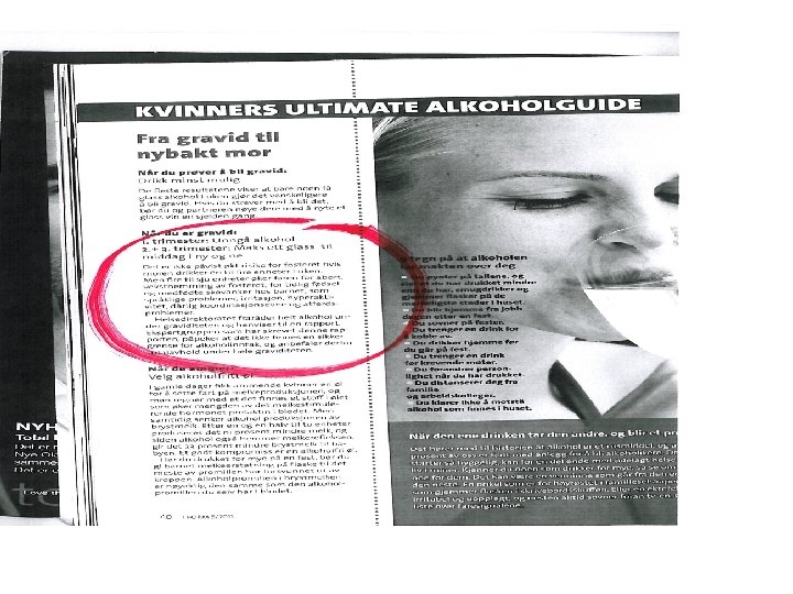 Alle rusmidler kan skade fosteret, men det er alkohol som er mest skadelig • • • 96% helt eller delvis uenig i påstand ”jeg drakk selv om jeg visste jeg var gravid” Hver andre kvinne oppgir at de kjenner noen som drakk litt i svangerskapet 34% oppgir bekymring fordi de har drukket alkohol før bekreftet graviditet 69% sier at lege eller jordmor ikke forklarte noe om hvilke konsekvenser det kan få om man drikker alkohol under svangerskap 14% sier at de kjenner noen som har fått annet råd fra helsepersonell enn totalavhold Synovate/helsedir. Sept. 11