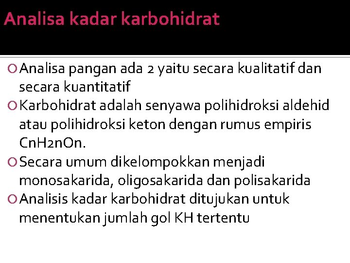 Analisa kadar karbohidrat Analisa pangan ada 2 yaitu secara kualitatif dan secara kuantitatif Karbohidrat adalah senyawa polihidroksi aldehid atau polihidroksi keton dengan rumus empiris Cn. H 2 n. On. Secara umum dikelompokkan menjadi monosakarida, oligosakarida dan polisakarida Analisis kadar karbohidrat ditujukan untuk menentukan jumlah gol KH tertentu