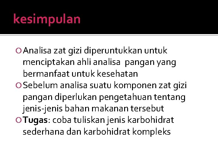kesimpulan Analisa zat gizi diperuntukkan untuk menciptakan ahli analisa pangan yang bermanfaat untuk kesehatan Sebelum analisa suatu komponen zat gizi pangan diperlukan pengetahuan tentang jenis-jenis bahan makanan tersebut Tugas: coba tuliskan jenis karbohidrat sederhana dan karbohidrat kompleks
