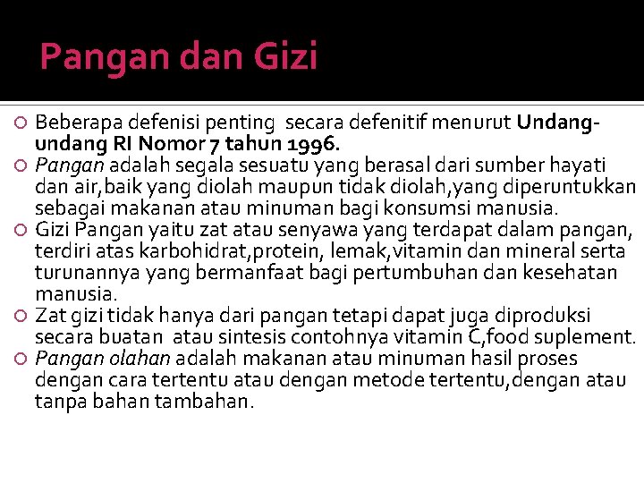 Pangan dan Gizi Beberapa defenisi penting secara defenitif menurut Undangundang RI Nomor 7 tahun 1996. Pangan adalah segala sesuatu yang berasal dari sumber hayati dan air, baik yang diolah maupun tidak diolah, yang diperuntukkan sebagai makanan atau minuman bagi konsumsi manusia. Gizi Pangan yaitu zat atau senyawa yang terdapat dalam pangan, terdiri atas karbohidrat, protein, lemak, vitamin dan mineral serta turunannya yang bermanfaat bagi pertumbuhan dan kesehatan manusia. Zat gizi tidak hanya dari pangan tetapi dapat juga diproduksi secara buatan atau sintesis contohnya vitamin C, food suplement. Pangan olahan adalah makanan atau minuman hasil proses dengan cara tertentu atau dengan metode tertentu, dengan atau tanpa bahan tambahan.