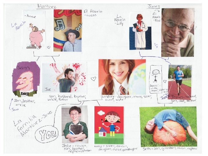 La Familia Martinez-Jones I. Use the family tree to respond to the following questions in complete Spanish sentences. Pretend it is your family. You are where it says “YOU”. 1. ¿Cómo se llama la esposa de Joe? _____________________ 2. ¿Cómo se llama tu primo? ________________________ 3. ¿Tienes tú un bisabuelo en tu familia? _________________________________________________ 4. ¿Cómo se llaman los hijos de Annie y Lucas? _______________________________________________ 5. ¿Tienes tú una prima? __________________________