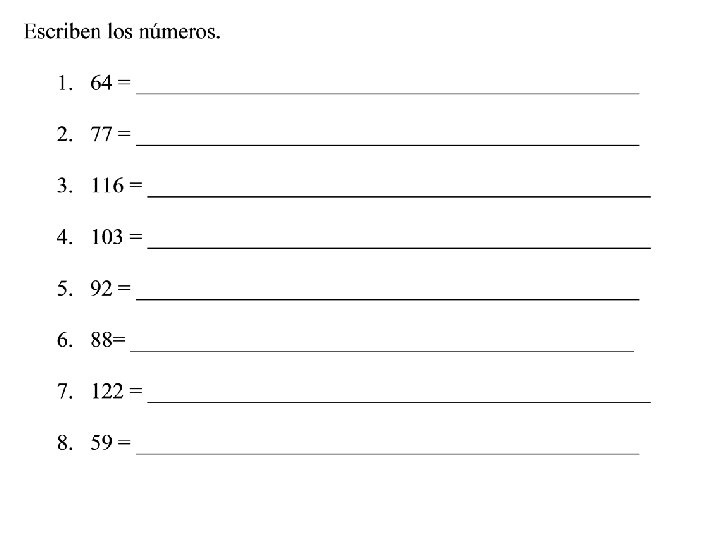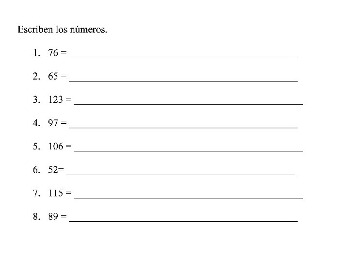 ¿Cuántos años tiene tu _______? Repasamos los números y aprendemos números nuevos – libro pa. 165 0 = cero 1 = uno 2=dos 3=tres 4=cuatro 5=cinco 6=seis 7=siete 8=ocho 9=nueve 10=diez 11=once 12=doce 13=trece 14=catorce 15=quince 16= dieciséis 17=diecisiete 18=dieciocho 19= diecinueve 20=veinte 21=veintiuno 22=veintidós 23=veintitrés 24 = veinticuatro 25 = veinticinco 26 = veintiséis 27 = veintisiete 28 = veintiocho 29 = veintinueve 30 = treinta 31 = treinta y uno 32 = treinta y dos 40 -cuarenta 50 -cincuenta 60 -sesenta 70 -setenta 80 -ochenta 90 -noventa 100 – cien 101 – ciento uno 123 – ciento veintitrés 164 – ciento sesenta y cuatro