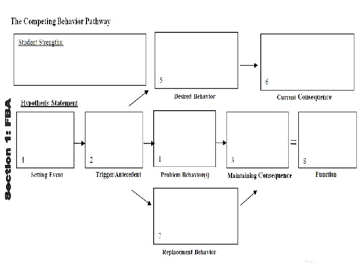 FBA/BIP Competing Behavior Pathway Student Strengths 5 6 Desired Behavior 4 Setting Event 2 1 Trigger/Antecedent Problem Behavior(s) 7 Replacement Behavior Adapted from Sugai, G. , Lewis-Palmer, T. , & Hagan-Burke, S. , 2000 Current Consequence 3 Maintaining Consequence 8 Function