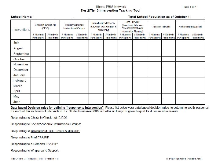 Positive Behavior Interventions & Supports: A Response to Intervention (Rt. I) Model Tier 1/Universal School-Wide Assessment School-Wide Prevention Systems Competing Behavior Pathway, Functional Assessment Interview, Scatter Plots, etc. nt er Int nt me (Behavior and Academic Goals) Illinois PBIS Network, Revised October 2009 Adapted from T. Scott, 2004 ve ss se Daily Progress Report (DPR) ion Tier 2/ Secondary As ODRs, Attendance, Tardies, Grades, DIBELS, etc. Tier 3/ Tertiary SIMEO Tools: HSC-T, RD-T, EI-T Check-in/ Check -out (CICO) Social/Academic Instructional Groups (SAIG) Group Intervention with Individualized Feature (e. g. , Check and Connect -Cn. C and Mentoring) Brief Functional Behavior Assessment/ Behavior Intervention Planning (FBA/BIP) Complex or Multiple-domain FBA/BIP Wraparound