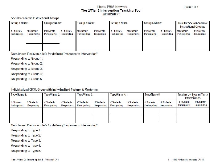 Recommended Time-frames for Data Review • Simple Secondary: (ex. Check-In/Check-Out, Social/Academic Instructional Groups) – Facilitator reviews bi-weekly, secondary system team only reviews in aggregate two times monthly • Individualized Simple Secondary: (ex. Check-&Connect, Brief FBA/BIP) – Facilitator reviews weekly, problem solving team reviews monthly for Brief FBA/BIP • Tertiary/Complex Individualized Interventions: (ex. FBA/BIP & Wraparound) – Facilitator reviews daily, team reviews weekly/biweekly
