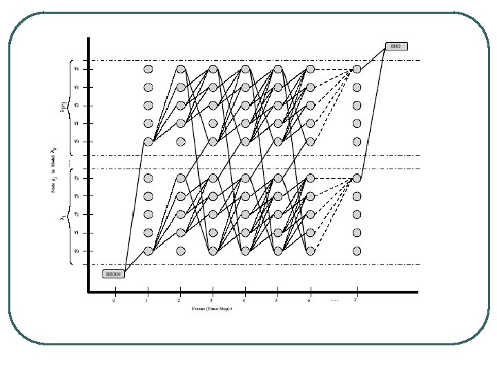 Decoding of HMM-based ASR l Decoding of HMM-based ASR • Searching the best path in a huge HMM-state lattice. l 1 -best ASR result • The best path one could find from backtracking. l State Lattice (Next page)