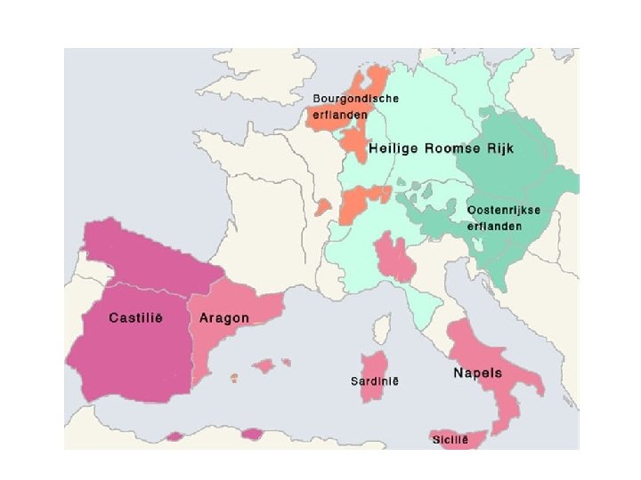 Karel V (1500 -1558) Keizer Ontdekkinsreiziger Habsburger Filips de Schone Johanna de Waanzinnige Margaretha van Oostenrijk • 1500: geboren in Gent als zoon van Filips de Schone & Johanna de Waanzinnige Filips II • Grootgebracht in Mechelen door tante Margaretha van Oostenrijk • 1506: erft Nederlanden • 1516: Spanje en Duitsland • “Rijk waar de zon nooit onder gaat” & “Heilige Roomse Rijk” • Niet populair