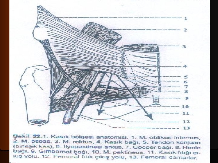 Kasık fıtıkları 2 l Direkt: l Doku zayıflığı nedeniyle Hasselbach üçgeninden çıkar l İnferior epigastrik damarların medialinde l Defekt genelde geniş tabanlı ve inkarserasyon/strangülasyon riski daha az l Artan yaşla sıklığı artar l Fiziksel aktivite ilişkilidir
