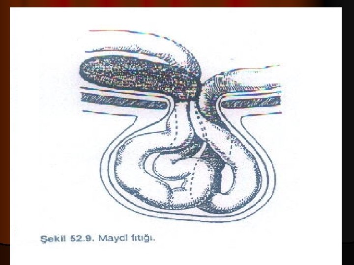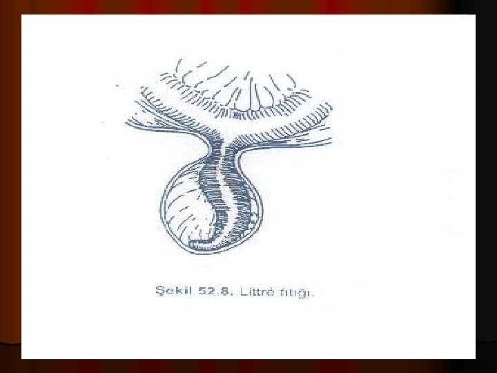 Fıtık Komplikasyonları 4 l Littre fıtığı, bu fıtıkta kese içinde Meckel divertikülü sıkışır l Genellikle beslenmesi giderek bozularak strangulasyona neden olur, buna rağmen mekanik barsak obstrüksiyonuna genellikle neden olmaz