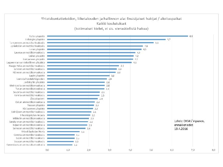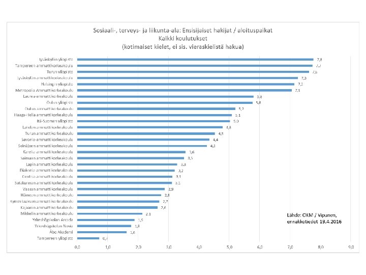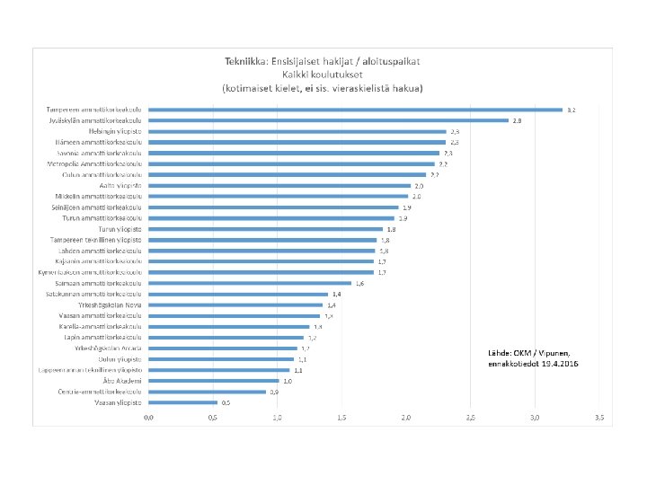 YAMK-koulutusten vetovoimaisuus, ensisijaiset hakijat/alpat, yhteishaku kevät 2016 Haaga-Helia Laurea Centria TAMK Humak Metropolia Savonia HAMK VAMK SAMK JAMK OAMK LAMK Se. AMK Diak KAMK Tu. AMK Novia Lapin AMK Ky. AMK MAMK Karelia Saimia Arcada 0. 00 9. 3. 2021 0. 50 1. 00 1. 50 2. 00 2. 50 3. 00 3. 50 4. 00 4. 50