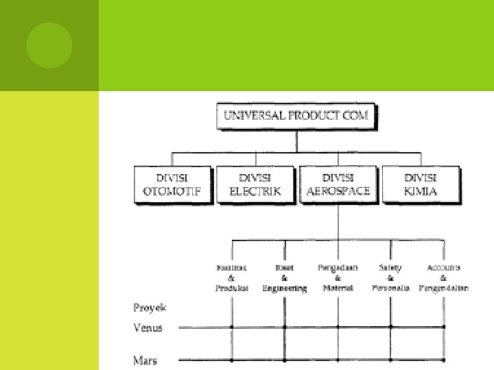 ORGANISASI MATRIKS Organisasi matriks adalah organisasi proyek murni yang melekat pada divisi fungsional pada organisasi induk. Menggabungkan kelebihan dari organisasi fungsional dengan organisasi proyek murni.