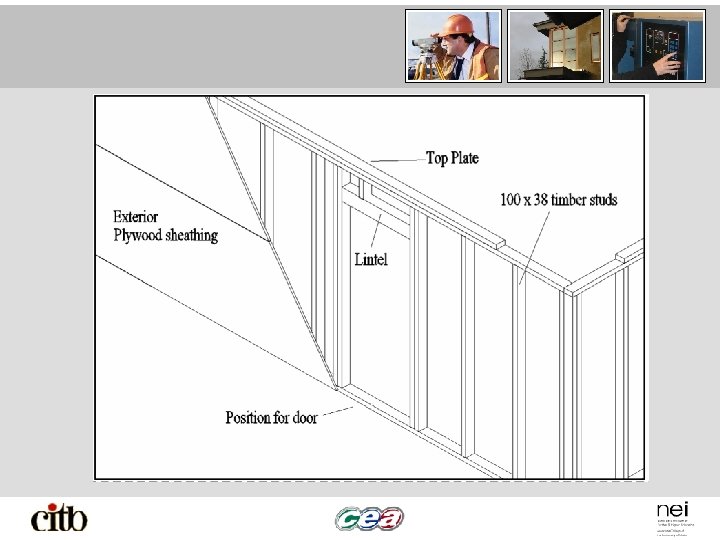 External walls The structural framed members of the external walls are constructed with light softwood timbers which are designed using stress graded timber to BS 4978. The studs are usually processed from basic sawn sizes of either 100 x 50 mm or 75 x 50 mm. These studs are usually spaced at 400 mm centres. The studs are nailed with simple butt joints to top and bottom plates of the same size. Panel sizes is dictated by an early decision on whether they are to be craned or manually lifted into position. The external walls are braced with sheet materials, usually water boil proof (WBP) plywood, nailed or stapled to the external face of the frame.