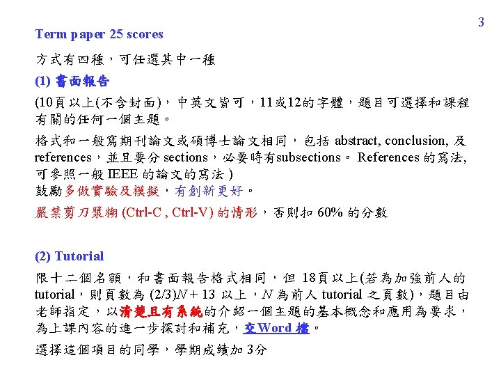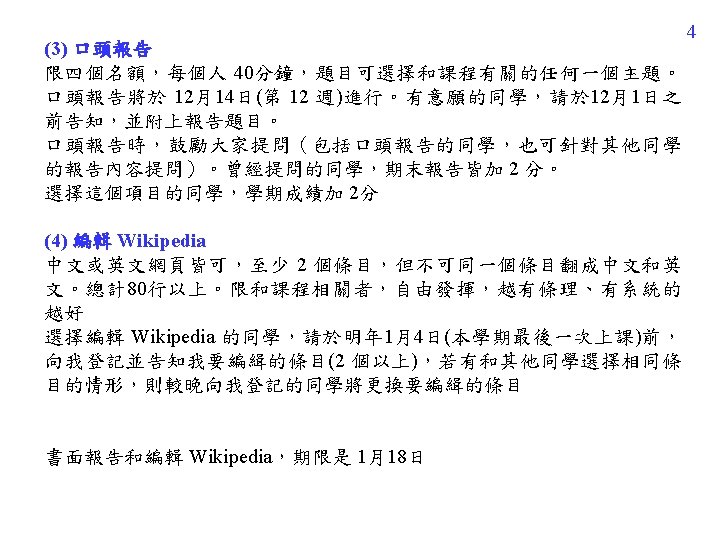 5 上課時間: 17 週 9/14, 11/16, 出 HW 3 9/21, 11/23, 9/28 11/30, 交 HW 3 10/5, 出 HW 1 12/7, 出 HW 4 10/12, 12/14, Oral 10/19, 交 HW 1 12/2`, 10/26, 出 HW 2 12/28, 交 HW 4, 11/2, 1/4, 出 HW 5 11/9, 交 HW 2 1/18, 交 HW 5 及 term paper