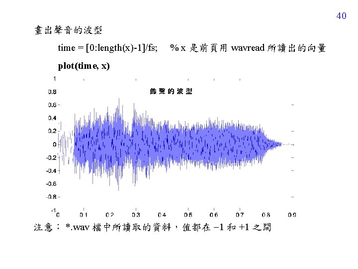 ![範例程式 (續): wavplay(audioarray, Fs); % 播放錄音的結果 t = [0: length(audioarray)-1]. /Fs; plot (t, audioarray‘); 範例程式 (續): wavplay(audioarray, Fs); % 播放錄音的結果 t = [0: length(audioarray)-1]. /Fs; plot (t, audioarray‘);](https://slidetodoc.com/presentation_image_h/f7b35a79ac1a7c52d45b9d2d6fd679d8/image-48.jpg)