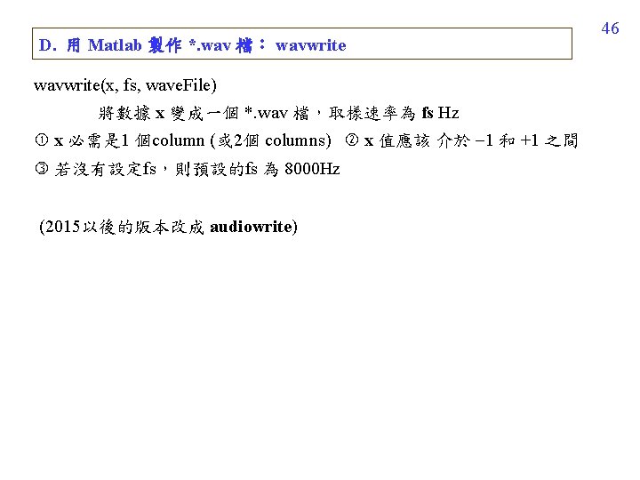![有些聲音檔是 雙聲道 (Stereo)的型態 (俗稱立體聲) 例: [x, fs]=wavread('C: WINDOWSMedianotify. wav'); size(x) = 29823 2 有些聲音檔是 雙聲道 (Stereo)的型態 (俗稱立體聲) 例: [x, fs]=wavread('C: WINDOWSMedianotify. wav'); size(x) = 29823 2](https://slidetodoc.com/presentation_image_h/f7b35a79ac1a7c52d45b9d2d6fd679d8/image-42.jpg)