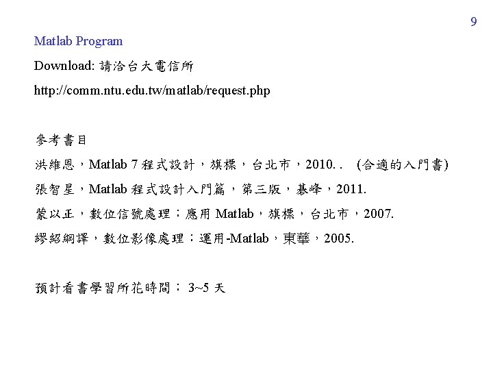 上課資料: (1) 講義 (將放在網頁上,請大家每次上課前先印好) (2) S. Qian and D. Chen, Joint Time-Frequency Analysis: Methods and Applications, Prentice-Hall, 1996. (3) L. Cohen, Time-Frequency Analysis, Prentice-Hall, New York, 1995. (4) K. Grochenig, Foundations of Time-Frequency Analysis, Birkhauser, Boston, 2001. (5) L. Debnath, Wavelet Transforms and Time-Frequency Signal Analysis, Birkhäuser, Boston, 2001. (6) S. Mallat, A Wavelet Tour of Signal Processing: The Sparse Way, Academic Press, 3 rd ed. , 2009. (7) Others 8