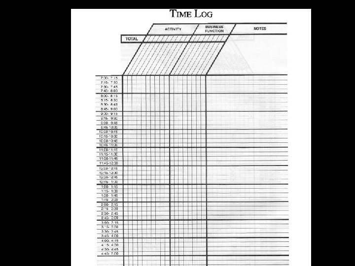 Time Journals It’s amazing what you learn! Monitor yourself in 15 minute increments for between 3 days and two weeks. Update every ½ hour: not at end of day