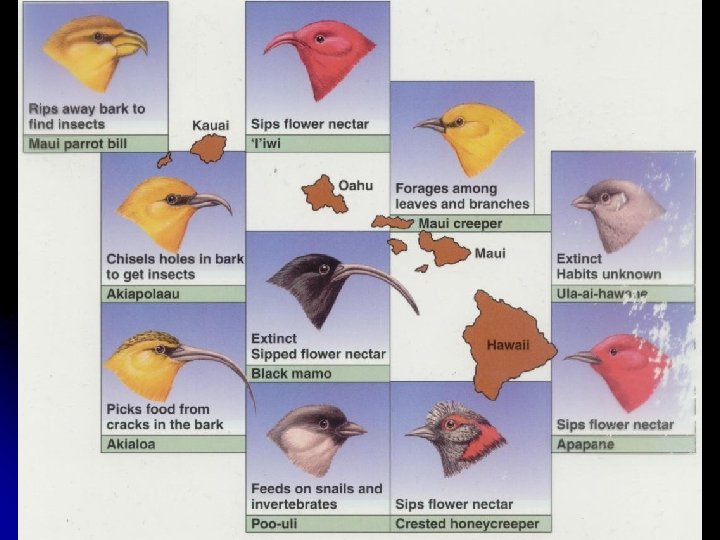 II. Speciation D. Adaptive Radiation • Evolution of many diversely adapted species from common ancestor Island chains offer unutilized habitat and open ecological niches • • • Ex: Colonization of Hawaii by honeycreepers Ex: Silversword alliance in Hawaii