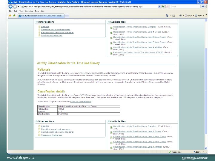 Creating the current Activity Classification: Step 2 – Evaluating Other Activity Classifications continued… The old New Zealand Activity Classification (1998 -99) and international activity classifications were evaluated against the needs of key users. The international activity classifications evaluated were: - - the Australian Bureau of Statistics (ABS) 2006 activity classification - the 2007 American activity classification (ATUS) - the 2000 Harmonised European activity classification (HETUS), and - the trial International Classification of Activities (ICATUS)
