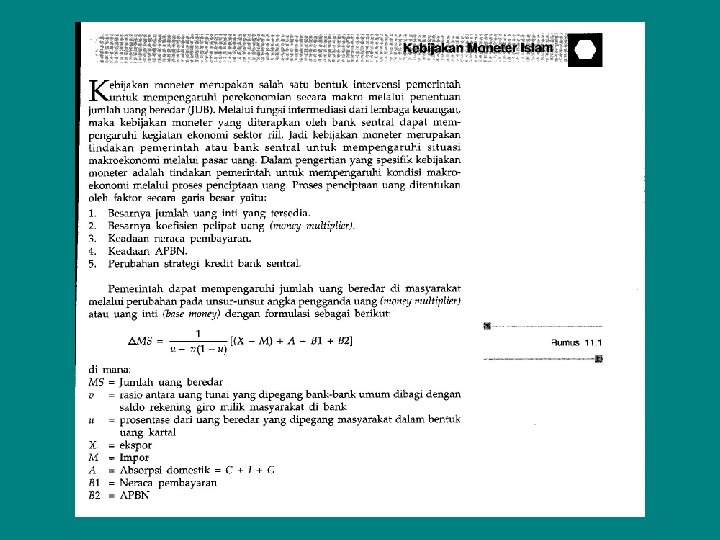 Konsep Aliran (Flow Concept) • Salah satunya adalah equation identity yang dicetuskan Irving Fisher yang menjelaskan pengaruh kecepatan peredaran uang (velocity of money) terhadap kegiatan sektor riil. Identitas tentang pengaruh kecepatan peredaran uang tsb ditunjukkan dengan simbol v pada formula MV = PT di mana semakin cepat peredaran uang (V) semakin tinggi pertumbuhan sektor riil. Rumusan persamaan kuantitas sbb : M x. V=Px. T M x. V=Px. O M x. V=Y M= Px. O V M = 1 P x O, jika 1 = k V V M = k. P x O M = k. Y Identitas atau persamaan di atas menunjukkan konsep stok (stock concept) tapi juga sekaligus konsep aliran (flow concept) tentang uang yang menunjukkan besarnya permintaan uang yang disimpan dalam bentuk kekayaan sebesar k dari besarnya pendapatan nasional Y. Konsepsi moneter Islam memandang bahwa uang sebagai flow concept, yaitu berperan strategis dalam menggerakan aktivitas ekonomi melalui fungsinya sebagai alat tukar. Islam mendorong pemilik kekayaan berupa uang untuk berinvestasi pada sektor produktif agar dapat memberikan keuntungan baik secara individual maupun sosial. Dalam Islam, uang tidak boleh ditahan tetapi harus diinvestasikan agar memberikan manfaat berupa peningkatan produksi barang dan jasa serta memberikan keuntungan bagi pemilik modal. Jadi, flow concept uang menunjukkan tanggungjawab sosial