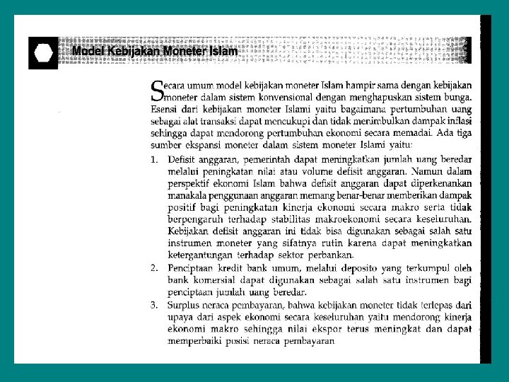 • • • Sistem Moneter Islami Prinsip kesederhanaan dalam pengeluaran. Akan memberi kemampuan untuk tabungan dan investasi. Perilaku berlebihan (boros) adalah perilaku yang bertentangan dengan moral Ekonomi Islam, karena menimbulkan ketimpangan ekonomi, pengurasan sumber daya ekonomi dan menjerumuskan perekonomian ke jurang stagflasi. Eliminasi penimbunan. Hakekat ekonomi Islam, semua sumber daya ekonomi harus dapat memberikan kemanfaatan bagi semua pihak untuk terwujudnya kehidupan ekonomi yang sejahtera. Praktek penimbunan, hanya membawa kesengsaraan dan berhentinya roda perekonomian sehingga menimbulkan rusaknya pilar-pilar ekonomi masyarakat. Efisiensi pemanfaatan tabungan, diarahkan pada alokasi sumber daya ekonomi secara efisien dan mendorong peningkatan produktivitas ekonomi. Mekanisme pengeluaran pemerintah untuk sektor-sektor yang meningkatkan kesejahteraan masyarakat dan mengurangi kebijakan defisit anggaran yang berdampak pada ketergantungan pada sektor keuangan. Pengeluaran pemerintah harus dicegah dari pemborosan dan kebocoran (KKN).