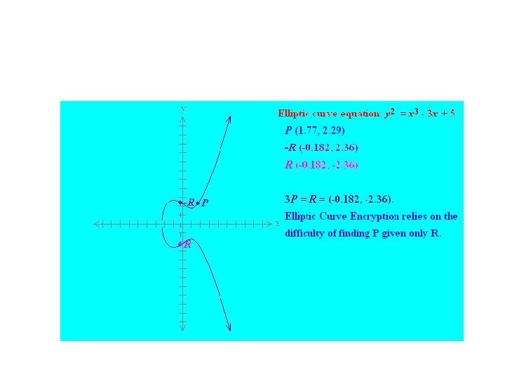 ECC Public Key Cryptosystem Public Key Y=y P Private Key Security: Difficult to solve for y by calculating P, 2 P, . . . , y. P =Y But there is efficient algorithm for computing k. P