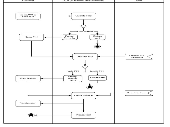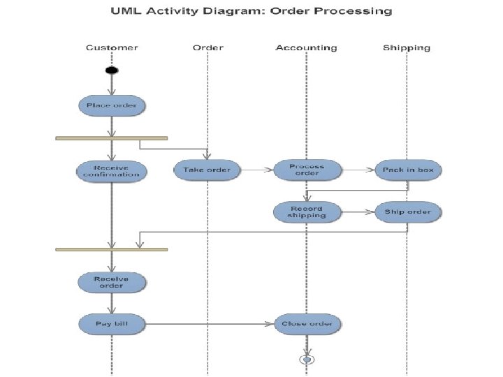 Swimlanes • Many times the activity diagram needs to partition in groups to represent the flow of business processes. • Each group represents the particular business flow belonging to some category, such group is called swimlane. • Swimlanes group related activities into one column. • Graphically it is denoted by vertical solid line. • It specifies certain set of activities. where each swimlane has a unique name.