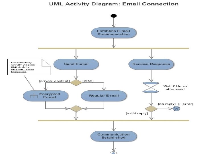 Decisions and Branching A diamond represents a decision with alternate paths. When an activity requires a decision prior to moving on to the next activity, add a diamond between the two activities. The outgoing alternates should be labeled with a condition or guard expression. You can also label one of the paths "else. “ Guards In UML, guards are a statement written next to a decision diamond that must be true before moving next to the next activity. These are not essential, but are useful when a specific answer, such as "Yes, three labels are printed, " is needed before moving forward.
