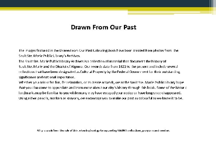 Colouring Book What: An adult colouring book created using archival photos. Purpose: To promote our Archival Photo Collection while generating funds for library programs, services and collections. Result: Estimating $4800. 00
