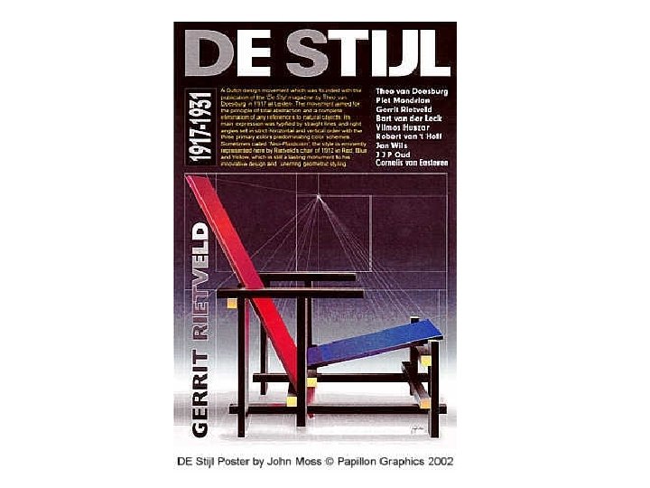 • Komposisi visual disederhanakan menjadi hanya bidang dan garis dalam arah horisontal dan vertikal, dengan menggunakan warna-warna primer seperti merah, biru, dan kuning di samping bantuan warna hitam dan putih • De stijl menerapkan prinsip simple dan abstrack di lukisan dan arsitektur dengan menggunakan garis lurus (vertikal dan horizontal ) dan bentuk persegi • De stijl menghindari bentuk simetris dan estetik keseimbangan dalam menerapkan komponennya • Dalam kebanyakan karya seni, garis vertikal dan horisontal tidak secara langsung bersilangan, tetapi saling melewati satu sama lain. Hal ini bisa dilihat dari lukisan Mondrian, Rietveld Schröder House, dan Red and blue chair