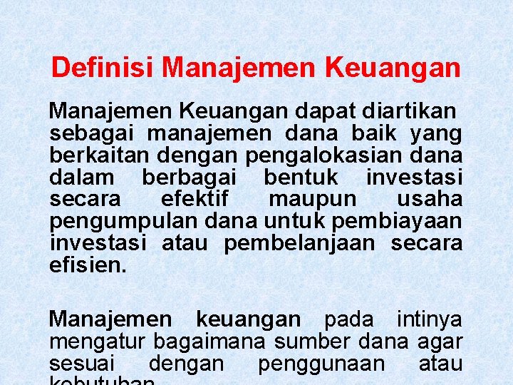 Definisi Manajemen Keuangan dapat diartikan sebagai manajemen dana baik yang berkaitan dengan pengalokasian dana dalam berbagai bentuk investasi secara efektif maupun usaha pengumpulan dana untuk pembiayaan investasi atau pembelanjaan secara efisien. Manajemen keuangan pada intinya mengatur bagaimana sumber dana agar sesuai dengan penggunaan atau