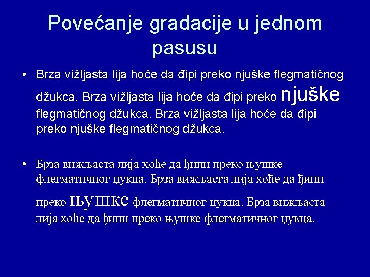 Povećanje gradacije • Isticanje važnih delova teksta može se postići povećanjem gradacije, ali se to retko radi u vezanom tekstu, jer to onda postavlja problem izbora optimalnog proreda između redova. Na primer, u knjižnom slogu osnovni tekst ćemo slagati iz garmonda (10 tt), naslove poglavlja iz cicera (12 tt), a primedbe i fusnote iz petita (8 tt). Naslovna strana se takođe rangira i često je cela iz verzalnih slova. 45
