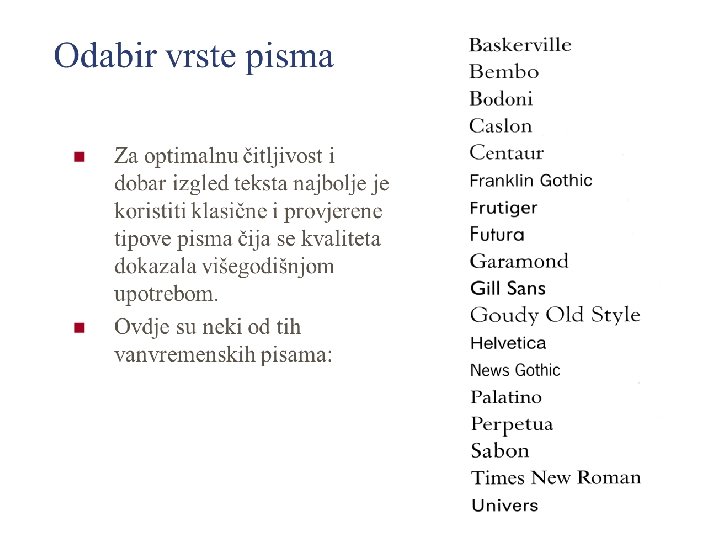 Osnovni pojmovi tipografije VERZAL velika slova (štampana ili tiskana slova) KURENT mala slova (pisana ili tiskana slova ) DESCENDER je dio slike slova ispod linije teksta, najčešće kod kurentnih slova (g, j, p, q, y) ASCENDER je dio na kurentnim slovima k, b, d, h, t, koji se izdiže iznad gornje linije koju određuju slova a, c, e, m, n, o, r… KURZIV su nagnuta slova, lijevo ili desno, kurzivna pisma su manje čitljiva pa se upotrebljavaju za naglašavanje, isticanje….