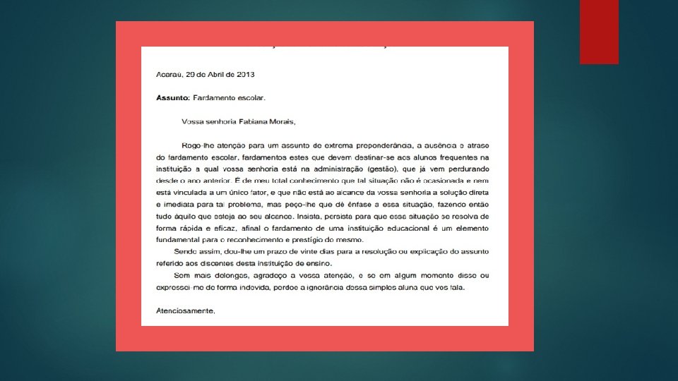 IV-Carta de Leitor Marcas Estruturais O editor da revista ou autor de dada matéria. Esse texto se assemelha ao modelo geral das cartas argumentativas, no entanto, prescinde de cabeçalho com local e data.