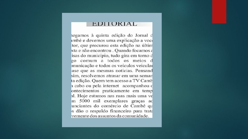 V- Editorial Leitor Marcas Estruturais O público leitor de determinada publicação Expressa a opinião de certa publicação, falando, portanto em nome coletivo. Sua linguagem tende a ser formal, embora acompanhe a expectativa do público leitor.