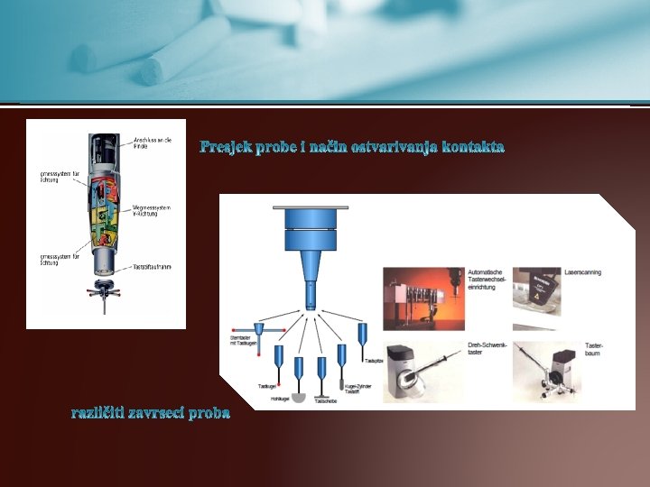 Sistem sondi • ISO standardima koji se odnose na koordinatnu metrologiju definiran je termin koji se koristi za senzor putem kojeg se ostvaruje veza između površine mjerenog komada-objekta i mjernog sistema za dužinu. Koristimo termin proba što znači dio koji dodiruje, opipava radni komad. Probe koje se koriste u koordinatnim mjernim mašinama mogu se podijeliti na: - optičke i - mehaničke (taktilne).