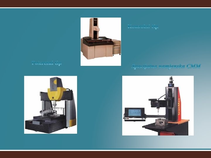 Tipovi i karatkeristike koordinatnih mašina • Univerzalni tipovi koordinatnih mjernih mašina su: • - stubni tip, • - konzolni tip, • -portalni tip, • - mostni tip
