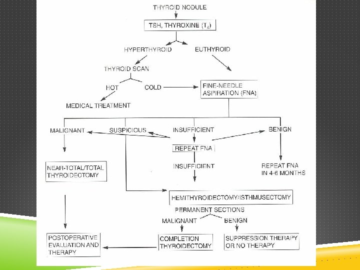 LABORATORY EVALUATION Obtain serum TSH in all patients with nodules If TSH is low, measure free T 4 and T 3 –May be an autonomous nodule or toxic multinodular goiter –May be a cold nodule in the setting of hyperthyroidism –High TSH would suggest Hashimoto’s or other thyroiditis (thyroid antibody may be useful)