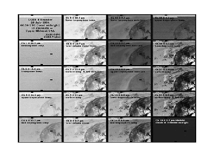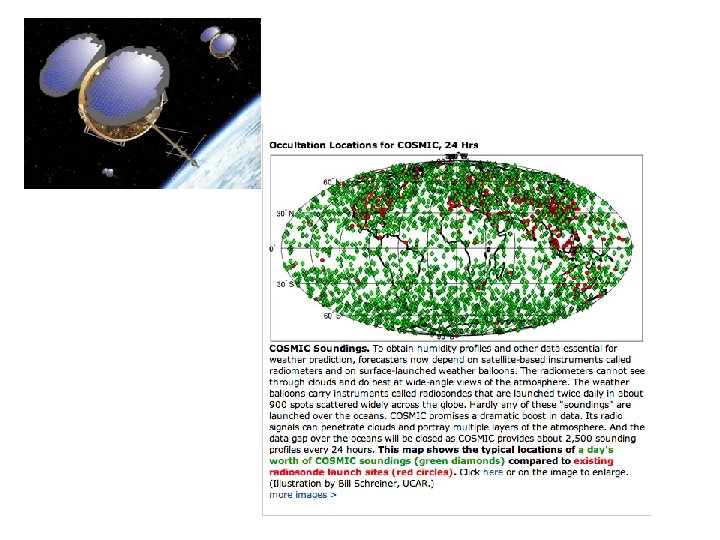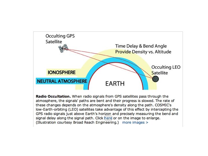 GPS Sounding • A constellation of GPS satellites orbit the earth. • By measuring the delay in time as the GPS signal is bent by the earth’s atmosphere, one can acquire density information that can be used to create temperature and humidity soundings. • Can do this with fixed receivers on earth or with receivers on satellites--the COSMIC project.