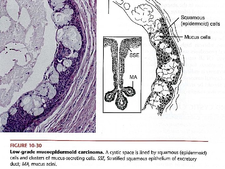 Histopathological features of Mucoepidermoid carcinoma The tumor composed of a mixture of mucus producing cells and squamous cells, mucus secreting cells vary in shape but contain abundant foamy cytoplasm that stain positively with mucus stain, the epidermoid cells are squamoid feature, often demonstrating polygonal shape. In addition third type of cells is typically present, the intermediat cells these cells are basaloid in appearance